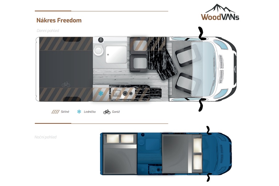 Verze Woodvans Freedom nabízí ideální poměr úložného a obytného prostoru pro pohodlný život i při dlouhodobém bydlení na cestách. ZDE ODKAZ.