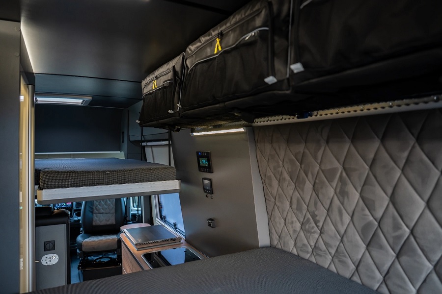 Nabízí spaní pro 4 osoby bez jakéhokoliv omezení úložných prostor díky posuvné stropní posteli pro 2 osoby