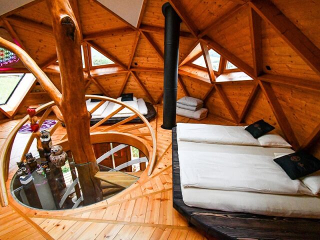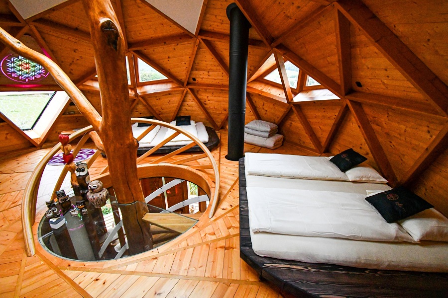 Umístili jsme ho nad Zahradou živlů, aby vám umožnil jedinečné spojení s přírodou. Stojí v blízkosti koňských pastvin a energeticky silného menhirového kruhu. Ze Sovího domku si užijete výhled na Černou horu i okolní krajinu. V létě si můžete z horní terasy trhat třešně či pozorovat pasoucí se koně. Domek má kruhový konopný půdorys a stavíme ho podle principů posvátné geometrie. Vstup vede po schodišti, takže není bezbariérový.