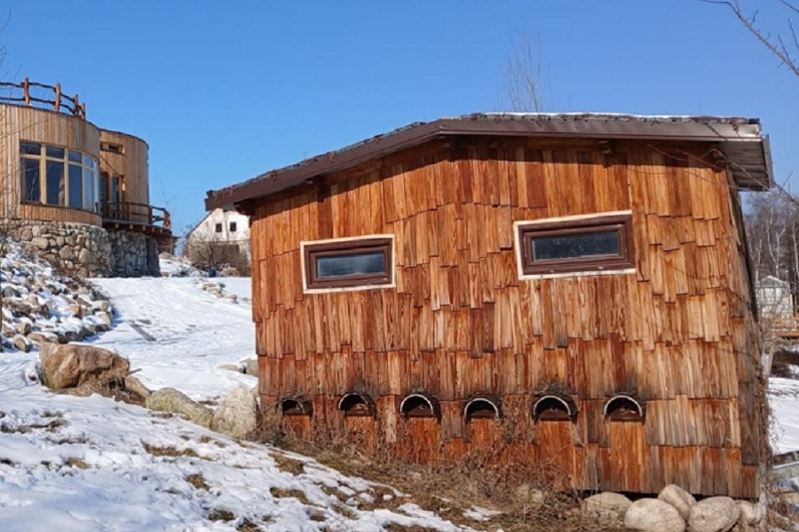 V dřevěném domku najdete po stranách instalované včelí úly a uvnitř dřevěný rošt s tenkou matrací.